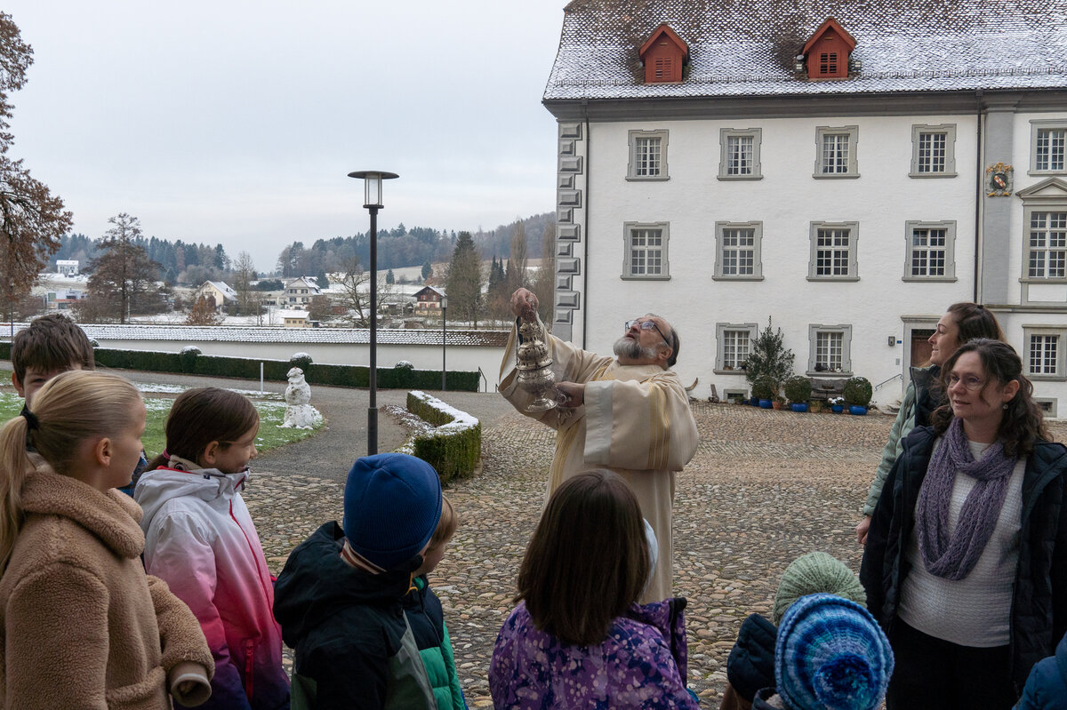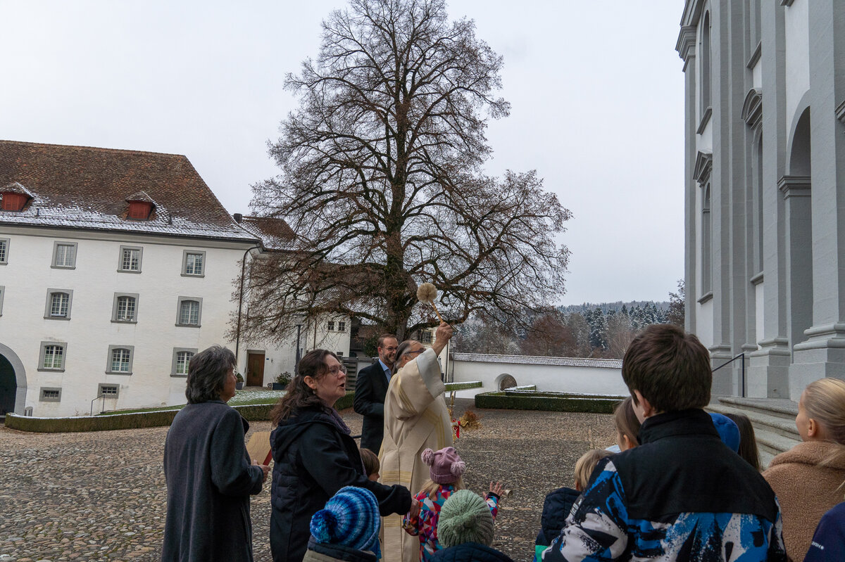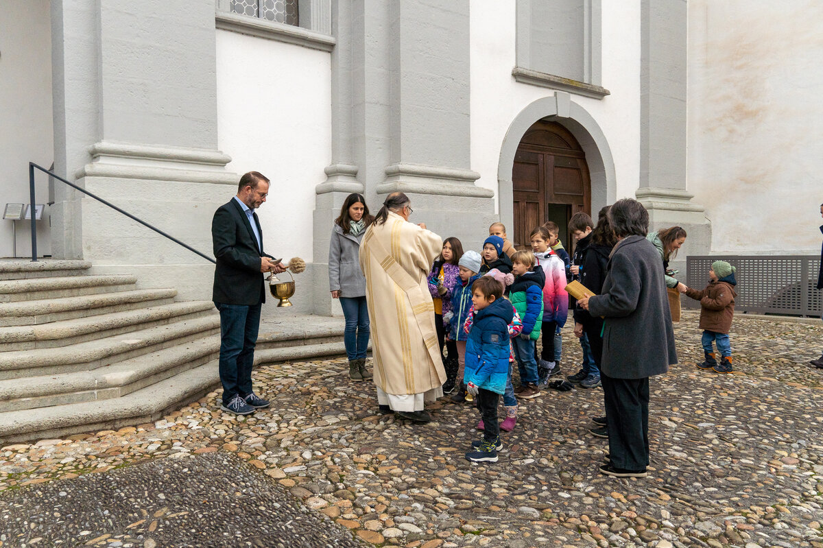 Bevor das imposante Glockengeläuft nach dem Einläuten mit dem Einzug der Sunntigsfiir-Kinder mit kleinen Glöckchen begrüsst wurde, fand draussen während des Einläutens des Gottesdienstes die Segnung der Glocken mit Weihwasser und Weihrauch im Beisein der Sunntigsfiir-Kinder statt. «Segen geht nach oben und kehrt zurück nach unten» so erklärt Sepp Hollinger den Sunntigsfiir-Kindern seine Handlung.