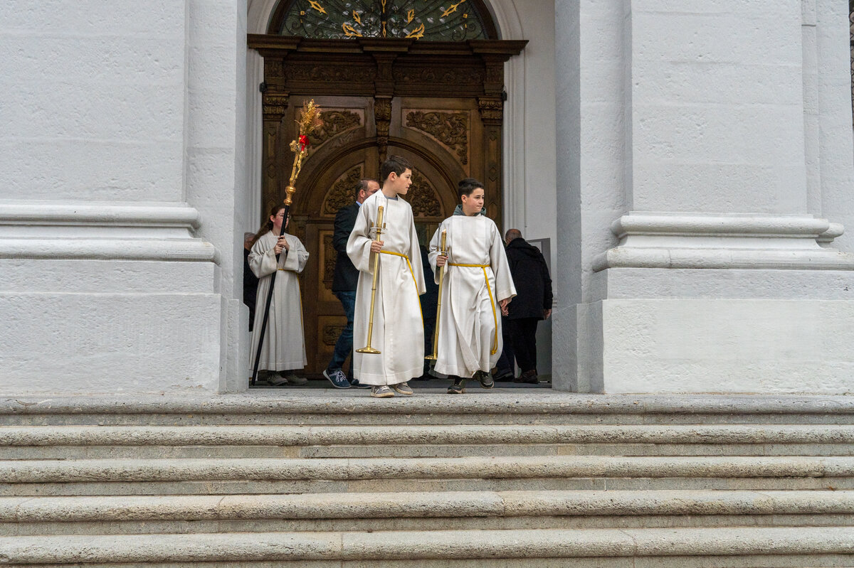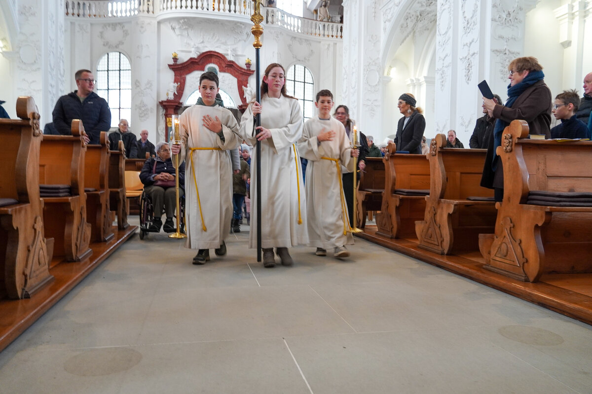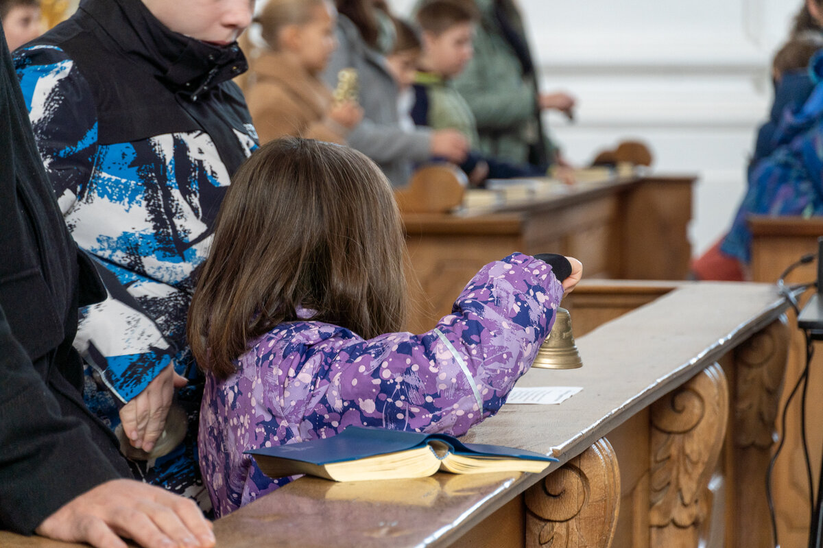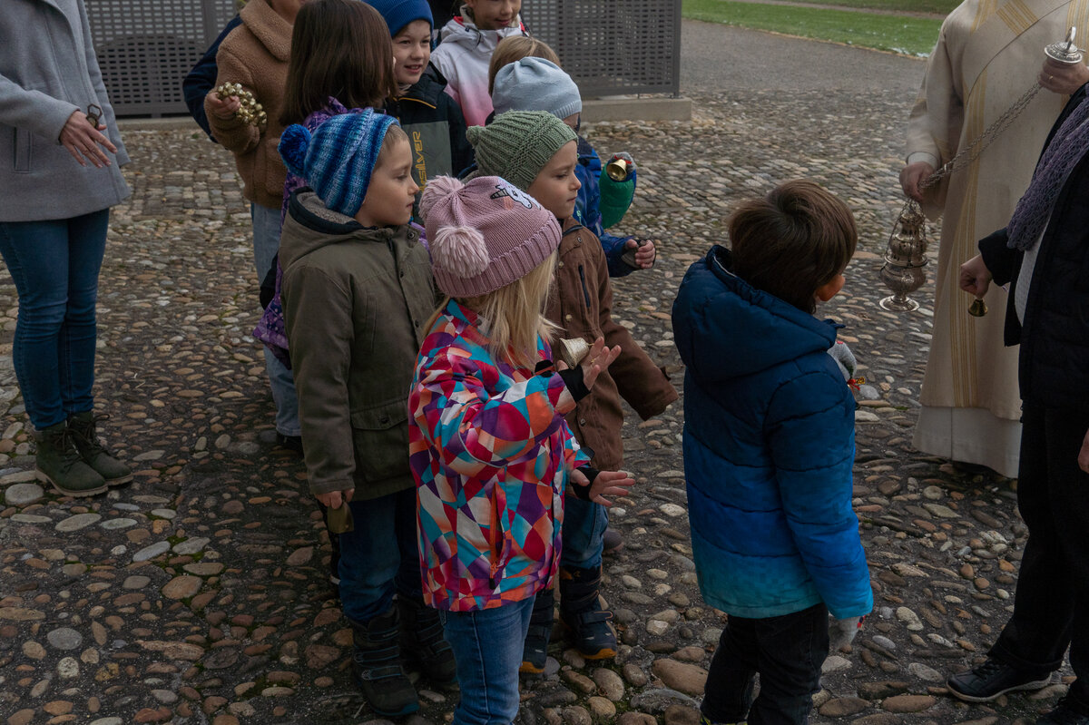 Bevor das imposante Glockengeläuft nach dem Einläuten mit dem Einzug der Sunntigsfiir-Kinder mit kleinen Glöckchen begrüsst wurde, fand draussen während des Einläutens des Gottesdienstes die Segnung der Glocken mit Weihwasser und Weihrauch im Beisein der Sunntigsfiir-Kinder statt. «Segen geht nach oben und kehrt zurück nach unten» so erklärt Sepp Hollinger den Sunntigsfiir-Kindern seine Handlung.