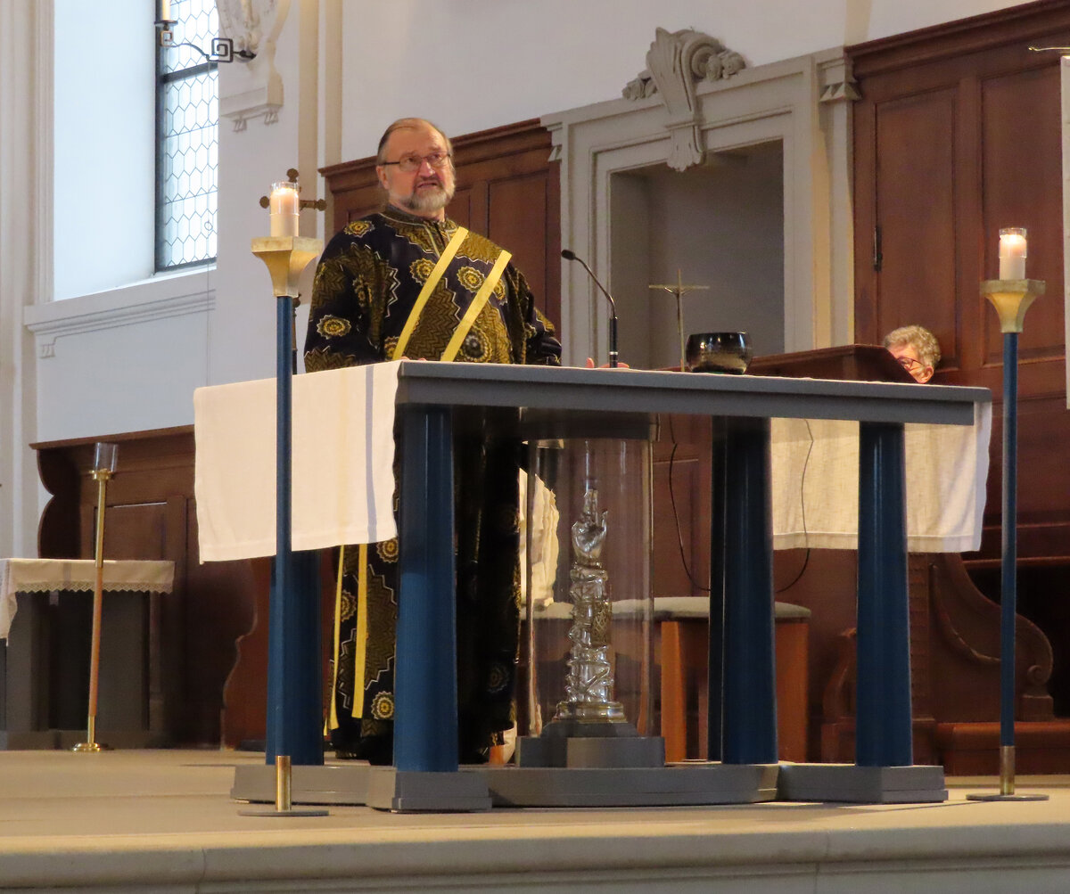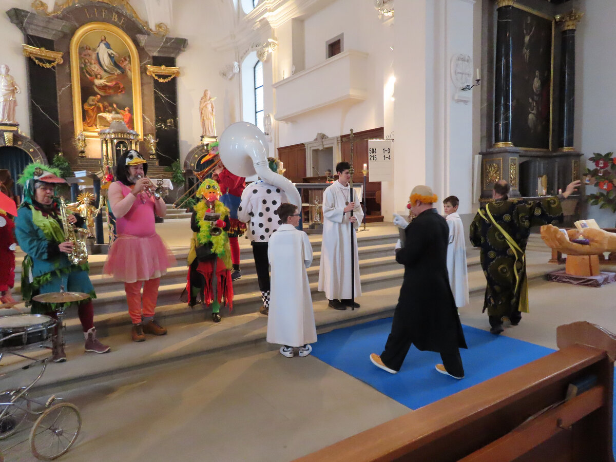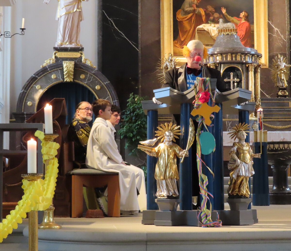 Der Diakon im bunten afrikanischen Gewand und der Lektor verkleidet als Clown, zogen gemeinsam mit den Ministranten in die Kirche ein.