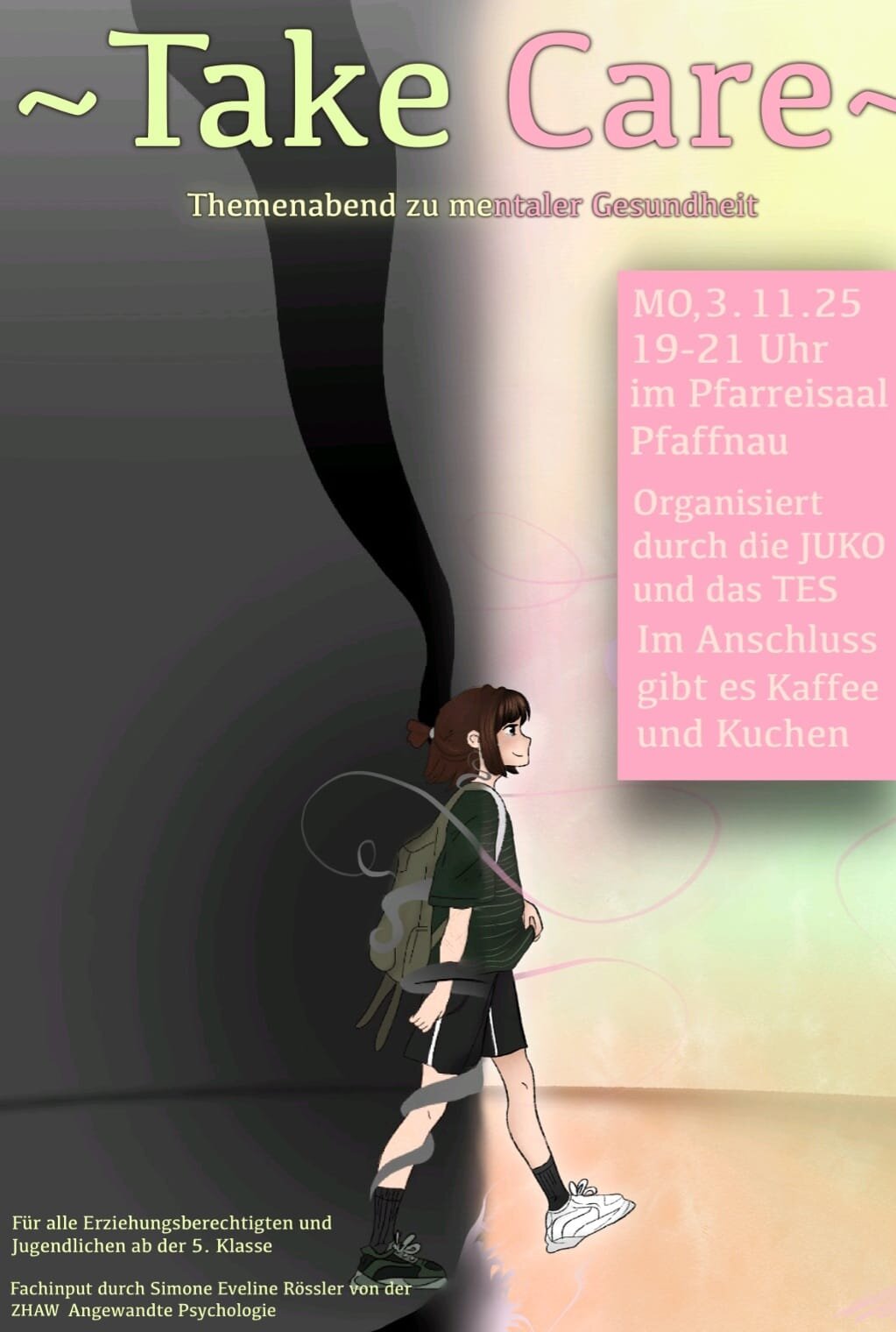 Eingeladen sind alle Erziehungsberichten sowie Jugendliche ab der 5. Klasse bis und mit 3. Oberstufe. Der Eintritt ist kostenlos und es braucht auch keine Anmeldung. Nach der Veranstaltung lädt die JUKO sowie das TES zu Kaffee und Kuchen ein.
