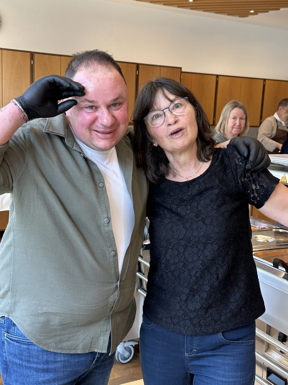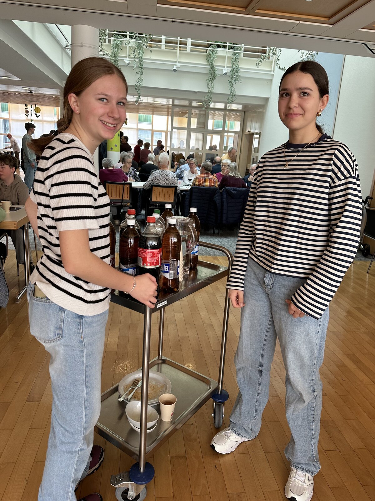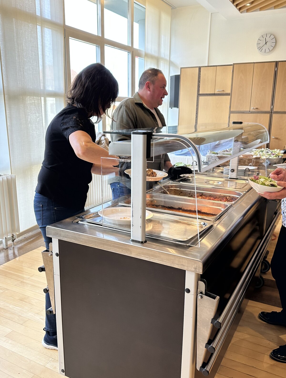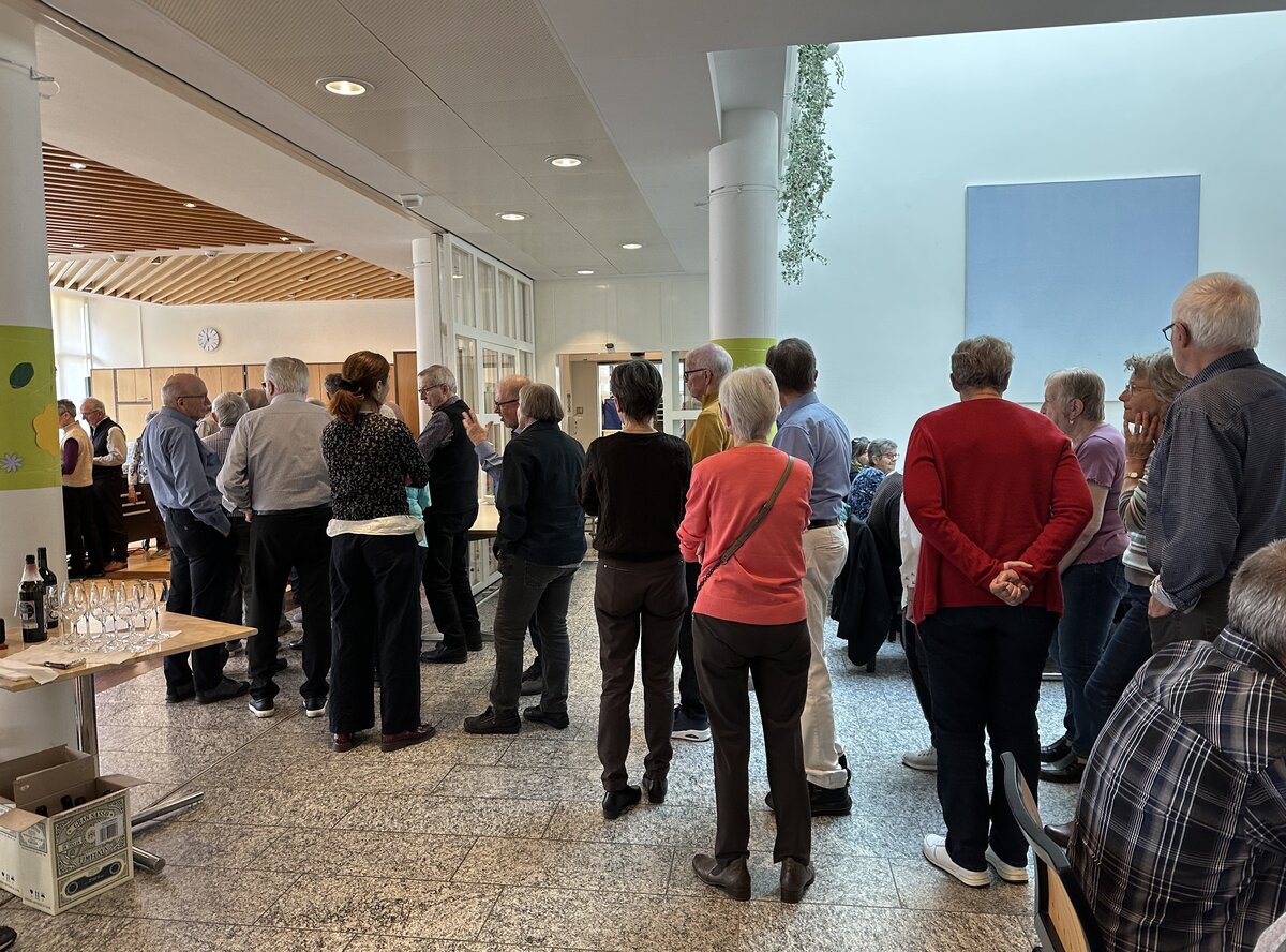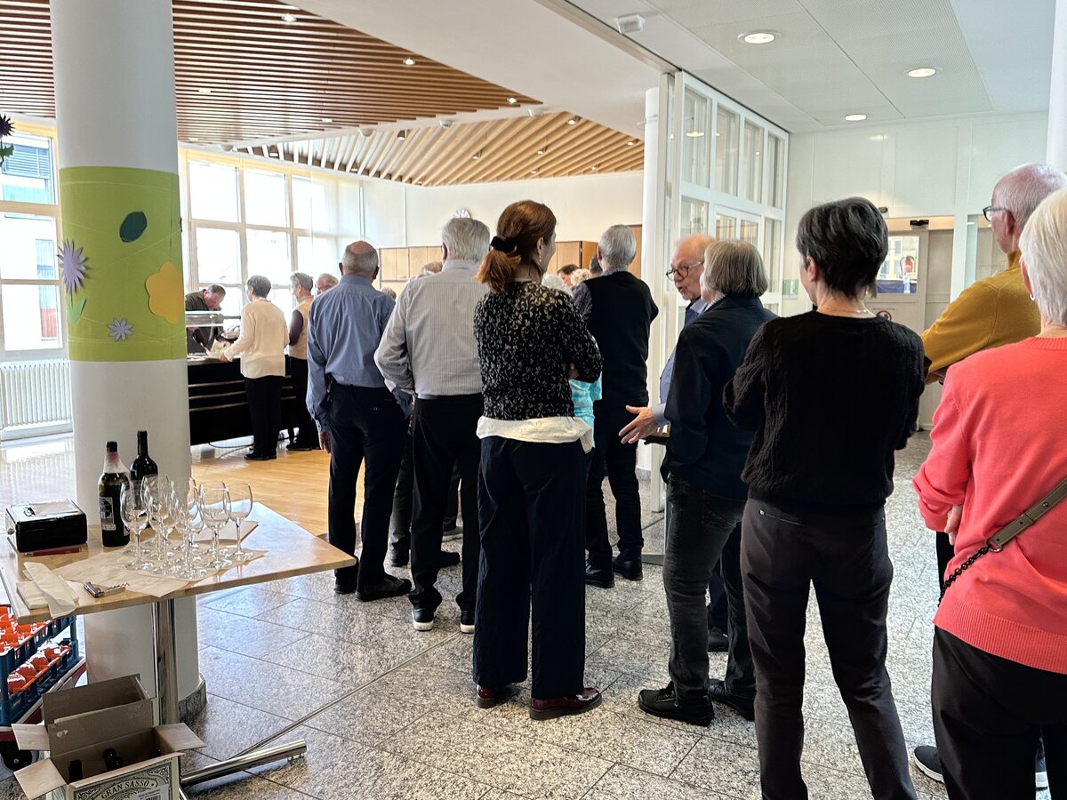 Im Anschluss an den Gottesdienst waren alle zum «Zäme am Tisch» im Feldheim eingeladen. Serviert wurden Lasagne mit Fleisch und Gemüse und Salat, welche von der Küchencrew des Feldheims vorbereitet wurde. Der Andrang war so gross, dass die Gäste zeitweise Schlange stehen mussten und die freiwilligen Helferinnen und Helfer ins Schwitzen kamen. Auch die Oberstufenschülerinnen und -schüler, die hier einen Sozialdienst leisteten, hatten alle Hände voll zu tun, alle Gäste mit Getränken zu versorgen. Dank der großartigen Infrastruktur des Feldheims, die unentgeltlich zur Verfügung gestellt wurde, und dem vollen Einsatz aller musste niemand hungrig nach Hause gehen. Die lange Warteschlange zeigte jedoch vor allem eines: Die Freude am gemeinsamen Essen und am Austausch waren gross.