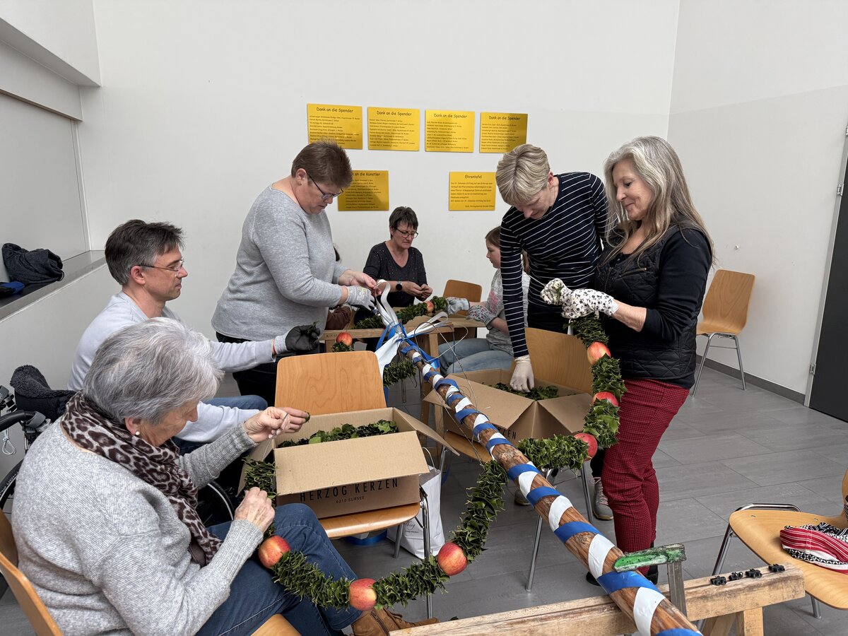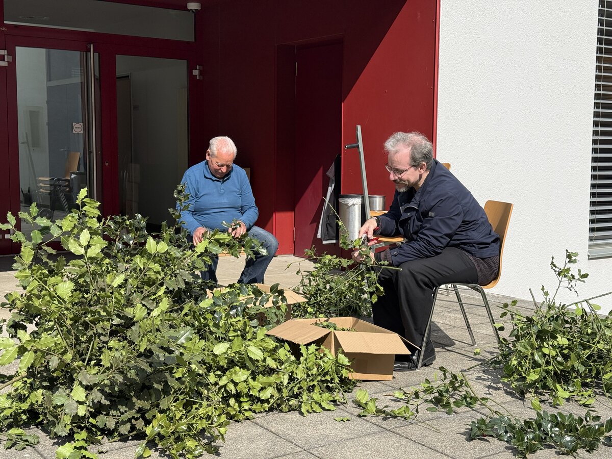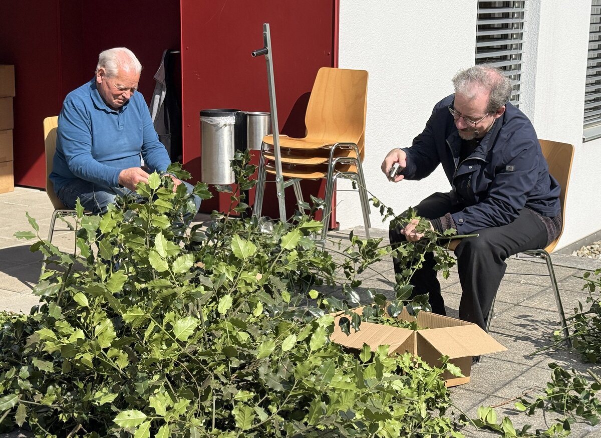 Am Mittwoch, 25. März waren freiwillige Helfende aus der Pfarrei sowie die Pfadi Reiden im Einsatz, um die Palmbäume herzustellen. Mit viel Geschick und Können machten sie sich ans Werk. Eine stachelige Angelegenheit, die wohl trotz Handschuhen und Achtsamkeit den einen oder anderen Kratzer auf den flinken Händen hinterlassen hat.