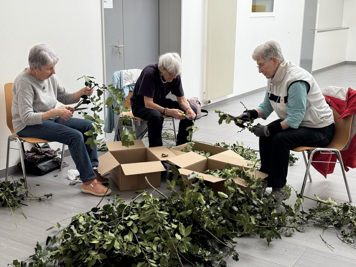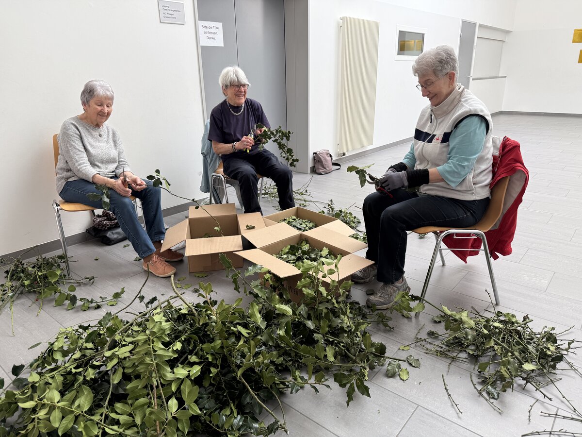 Bereits am Montag, 23. März trafen sich die ersten Helferinnen und Helfer im Pfarreizentrum Reiden, um eine wertvolle Vorarbeit in Angriff zu nehmen. Die Palmblätter wurden geschnitten.