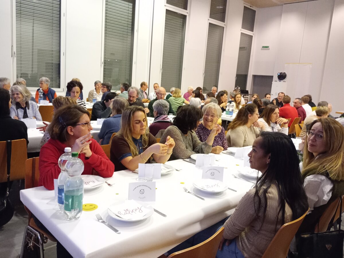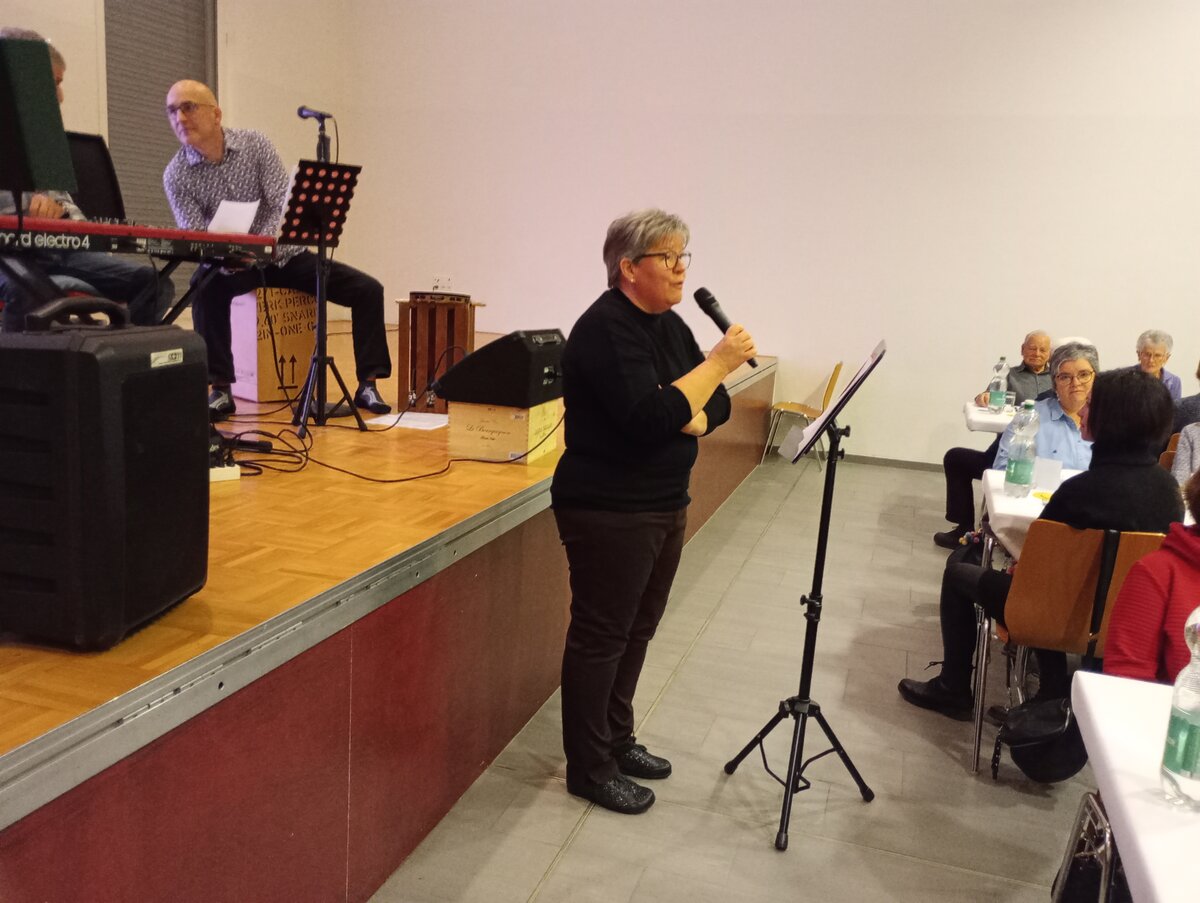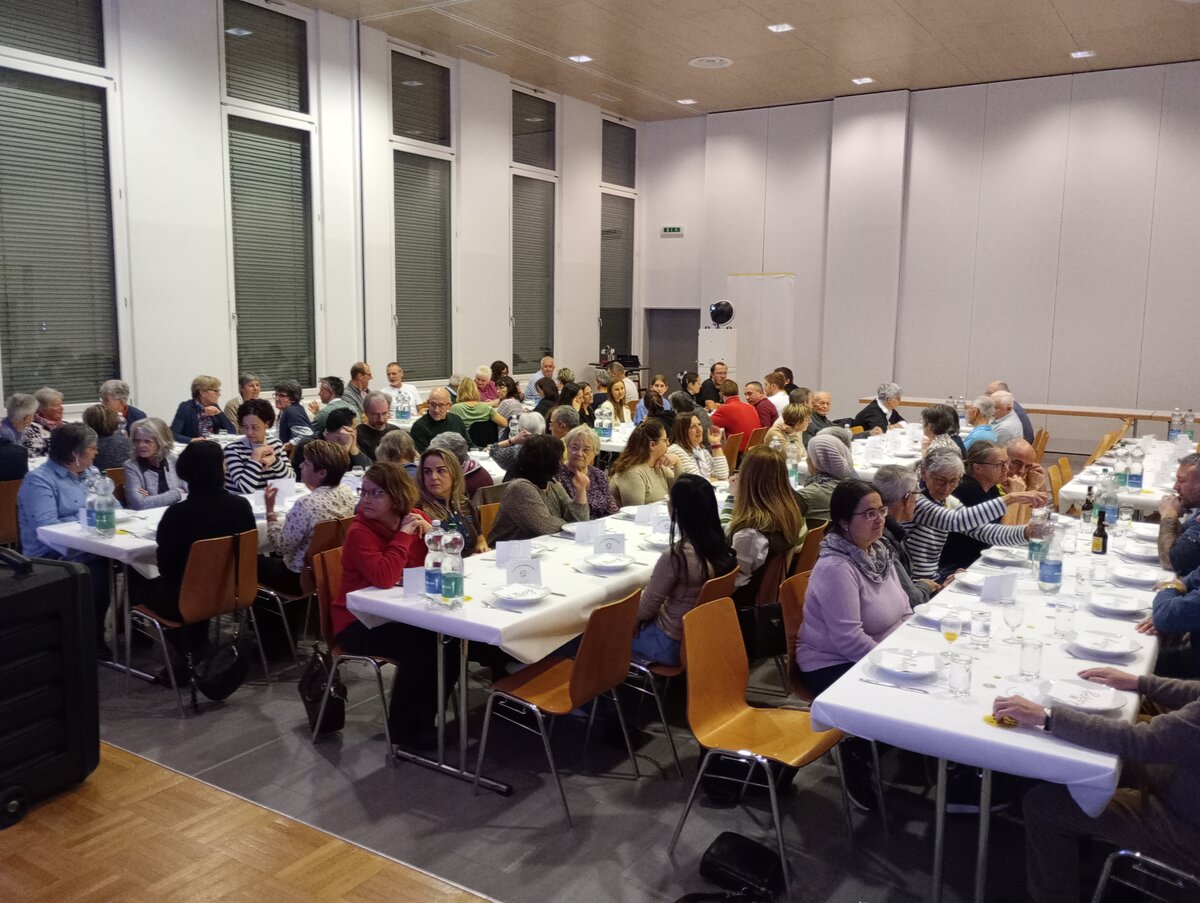 Ein Blick in die Runde zeigte deutlich, dass sich sicher drei Generationen zu diesem beliebten Anlass trafen. Im schön gedeckten Saal ergriff Pfarreiseelsorgerin Christa Kuster das Wort. Mit liebevoll gewählten Worten dankte sie allen für den grossen Einsatz, der in verschiedensten Funktionen geleistet wurde. Ihre Worte galten sowohl den Mitarbeitenden als auch den ehrenamtlichen Helferinnen und Helfer: „Ihr macht das Wirken der Kirche sichtbar“ sagte sie.