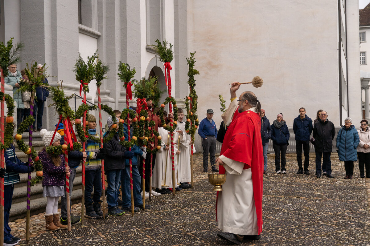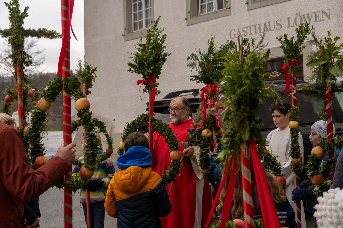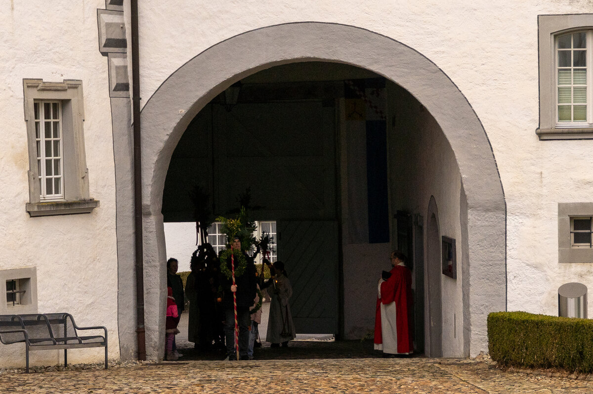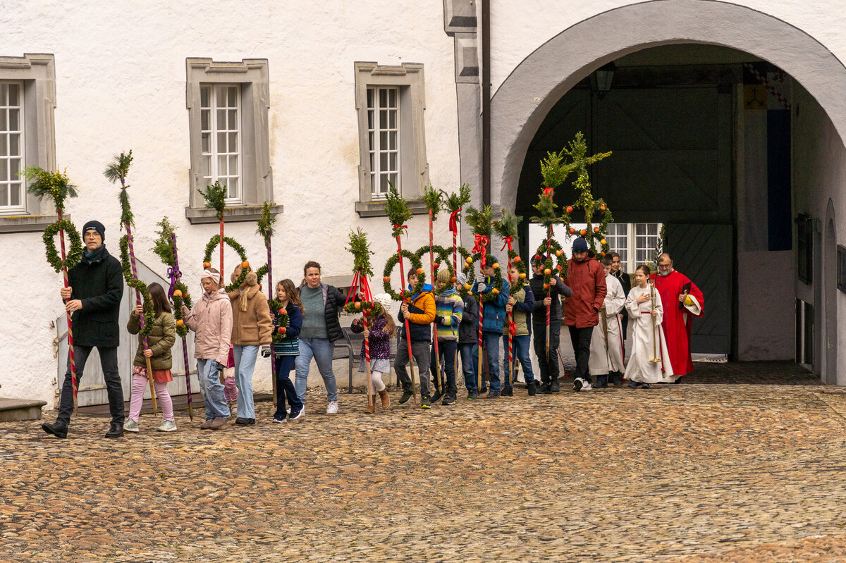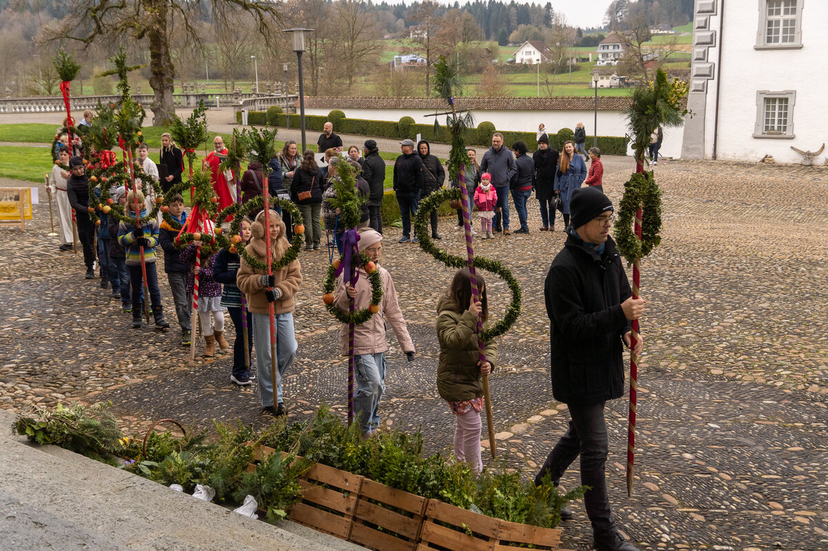 Die Kinder hatten bereits einige Tage zuvor ihre Palmen gebunden, die sie nun voller Stolz in einer Prozession zur Kirche trugen. Zuvor wurde der Ablauf noch einmal besprochen. Nach der Einführung wurden die Palmengebinde gesegnet. Anschliessend trugen die Kinder ihre Palmen unter der Führung der Ministranten in die Kirche hinein.