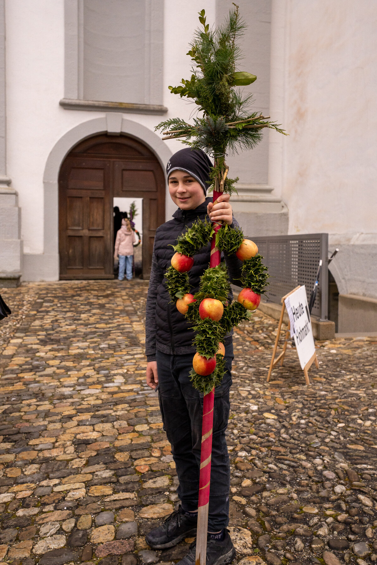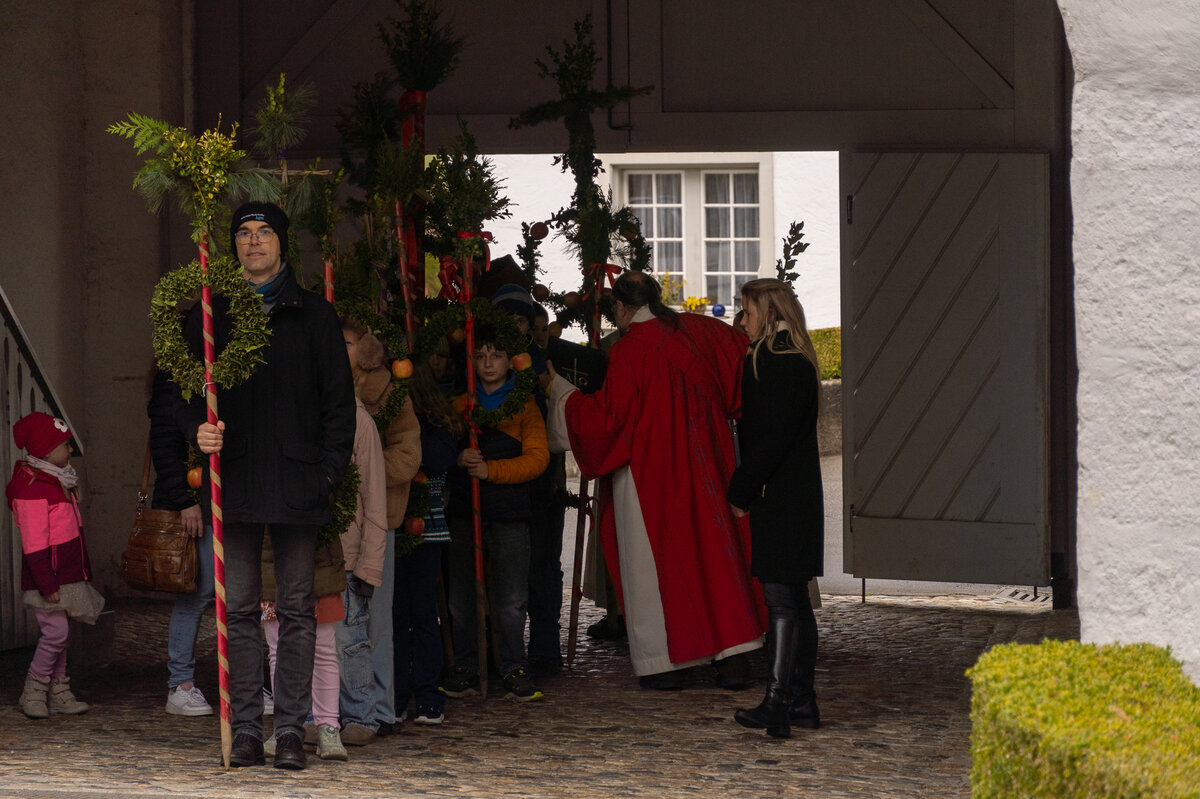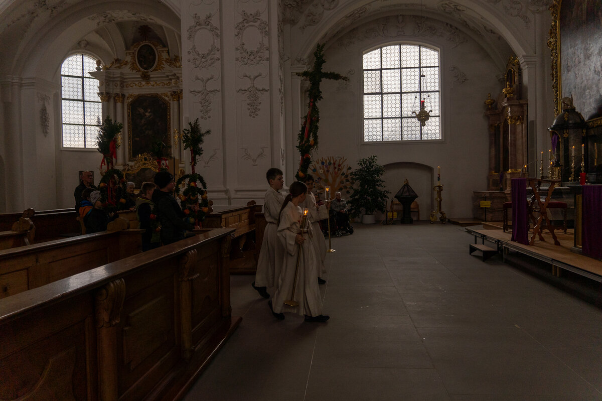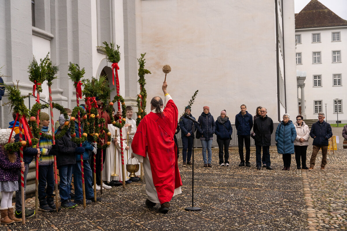 Die Kinder hatten bereits einige Tage zuvor ihre Palmen gebunden, die sie nun voller Stolz in einer Prozession zur Kirche trugen. Zuvor wurde der Ablauf noch einmal besprochen. Nach der Einführung wurden die Palmengebinde gesegnet. Anschliessend trugen die Kinder ihre Palmen unter der Führung der Ministranten in die Kirche hinein.